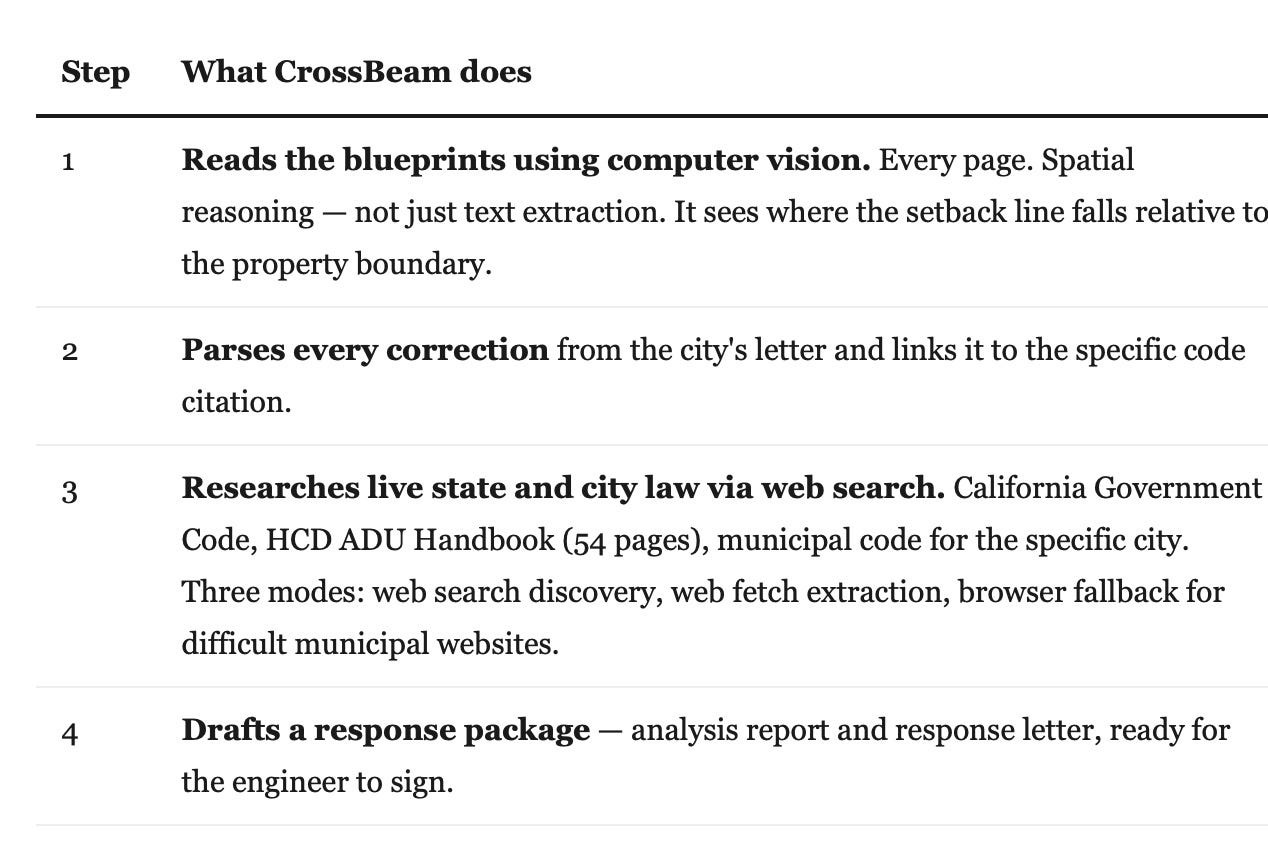 So Mike built CrossBeam. You upload your correction letter and your construction plans. What happens next is remarkable: