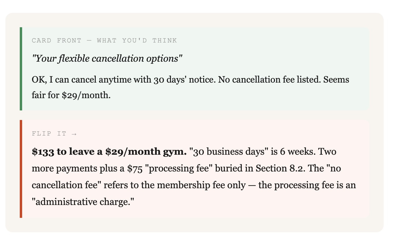 You upload a document — a lease, a gym contract, app terms, anything you didn’t write. FlipSide shows you two readings of the same clause. The first is how you’d read it: “Yeah, they just need 30 days’ notice, makes sense.” The second is how the person who wrote it reads it: 30 business days is six calendar weeks, you owe two more payments, plus a fee that isn’t called a fee. The clause doesn’t lie. Every word is accurate. The trick is in what’s missing: no cap, no appeal, no definition of “administrative charge.”