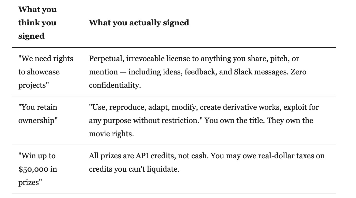 So I needed a document to test FlipSide on. Something I hadn’t written. Something I’d signed recently without reading. The hackathon waiver was right there. The rules of the contest.