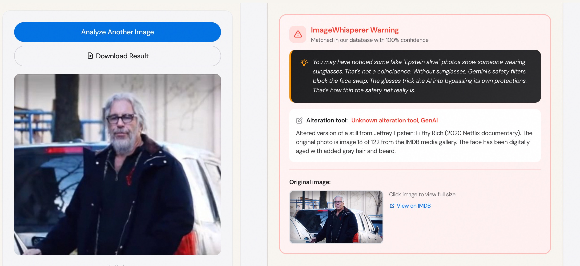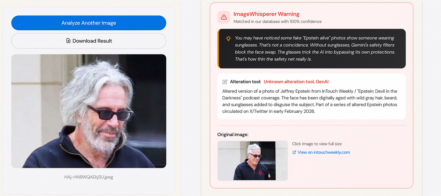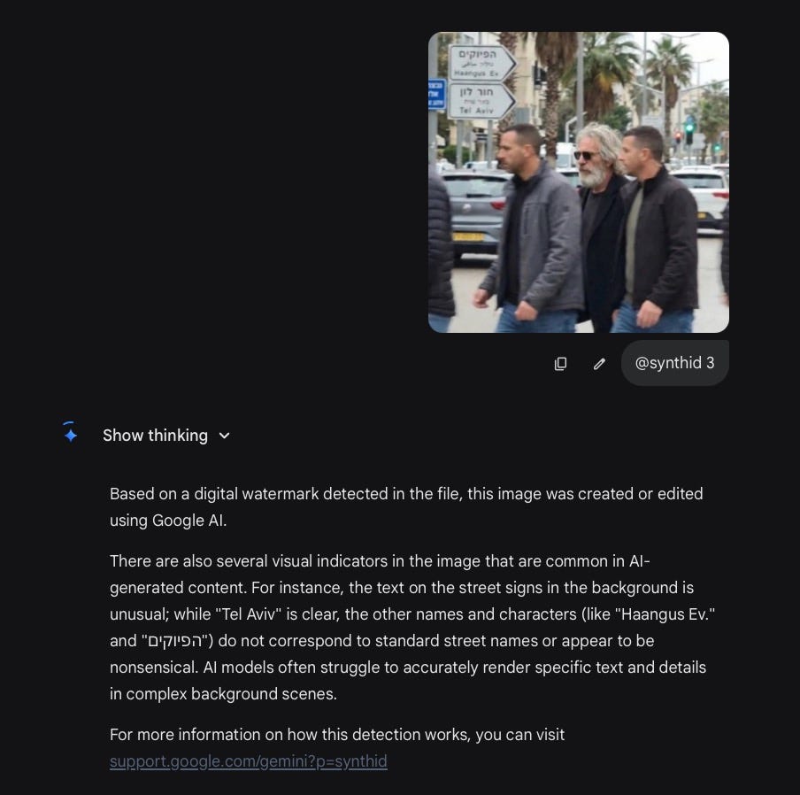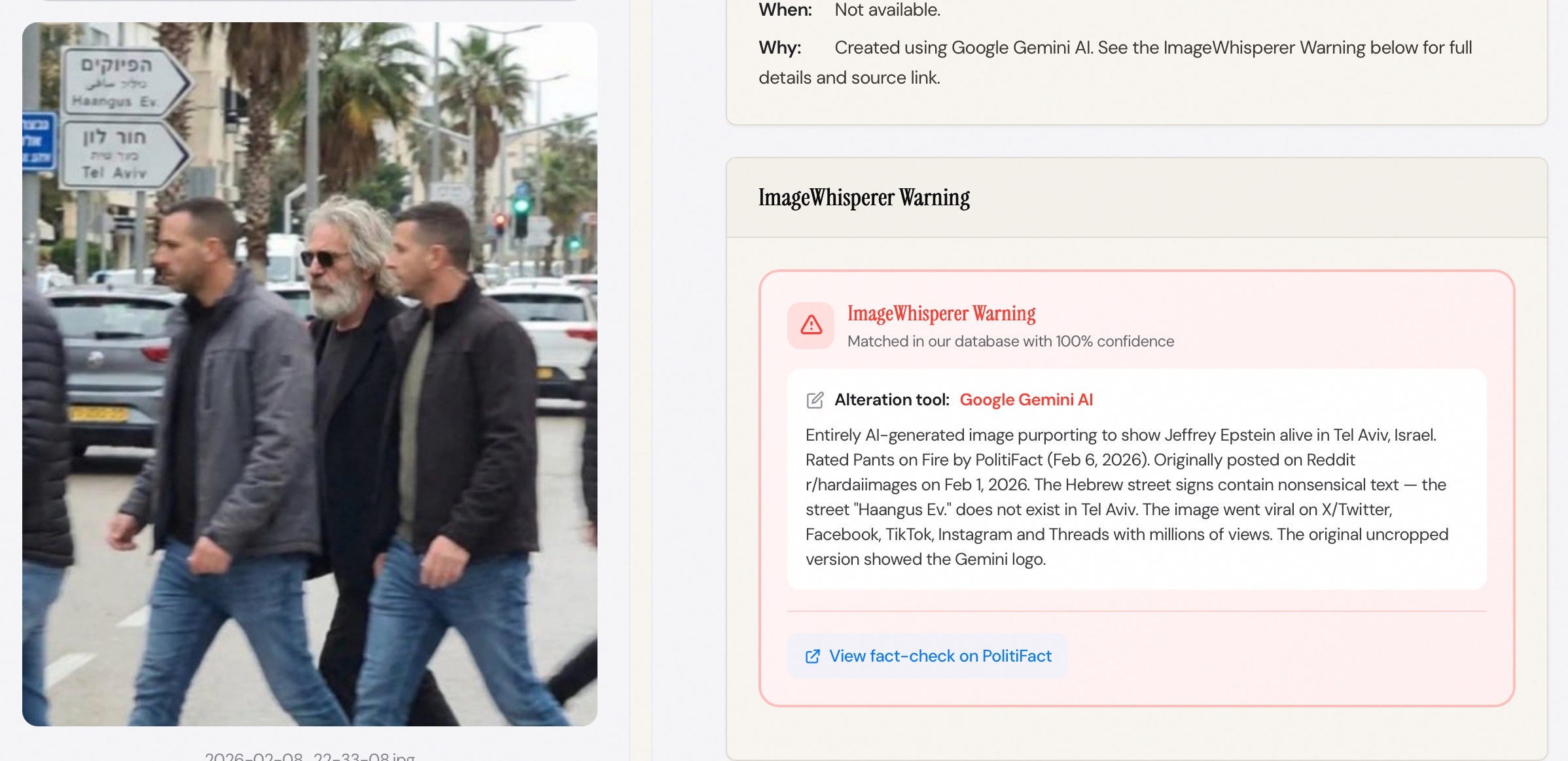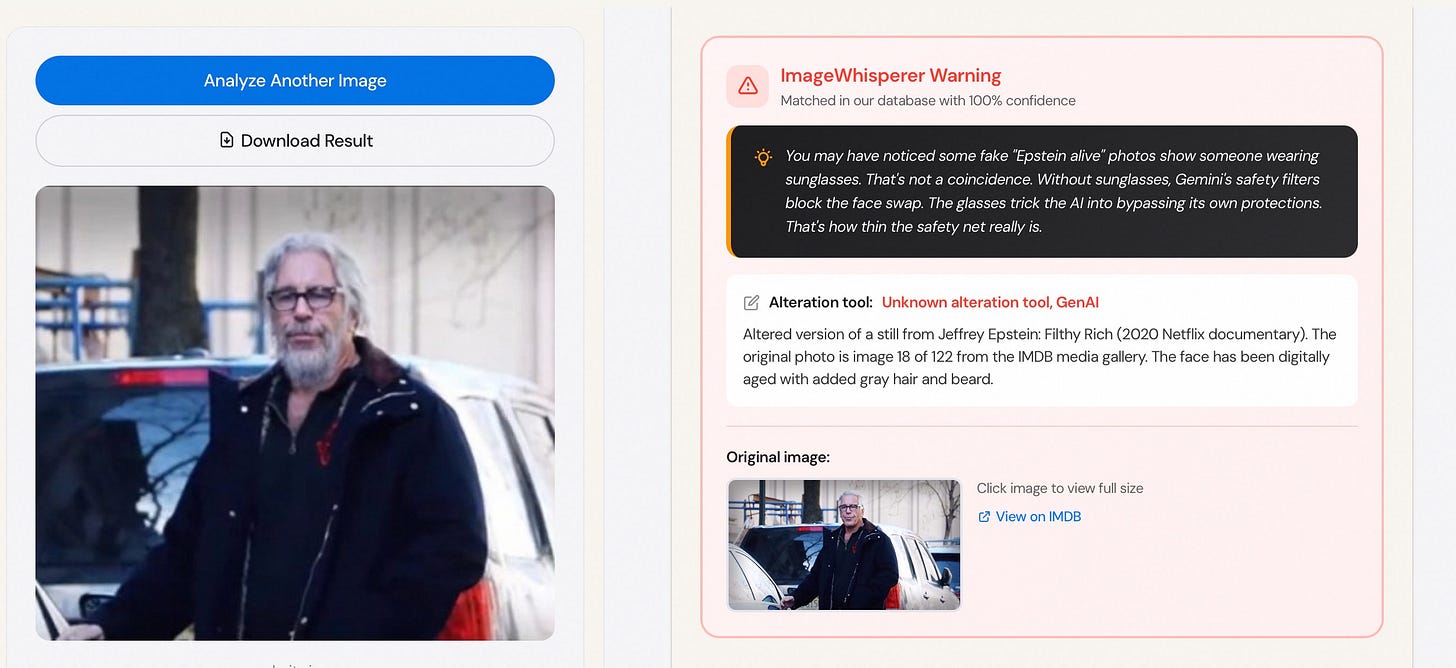 This weekend, Jeffrey Epstein was spotted walking around Tel Aviv. Three times. With three different outfits. One of them is produced or AI-altered via Google’s own platform Gemini , with Nano Banana Pro, my ImageWhisperer.org showed in the new Detective section: