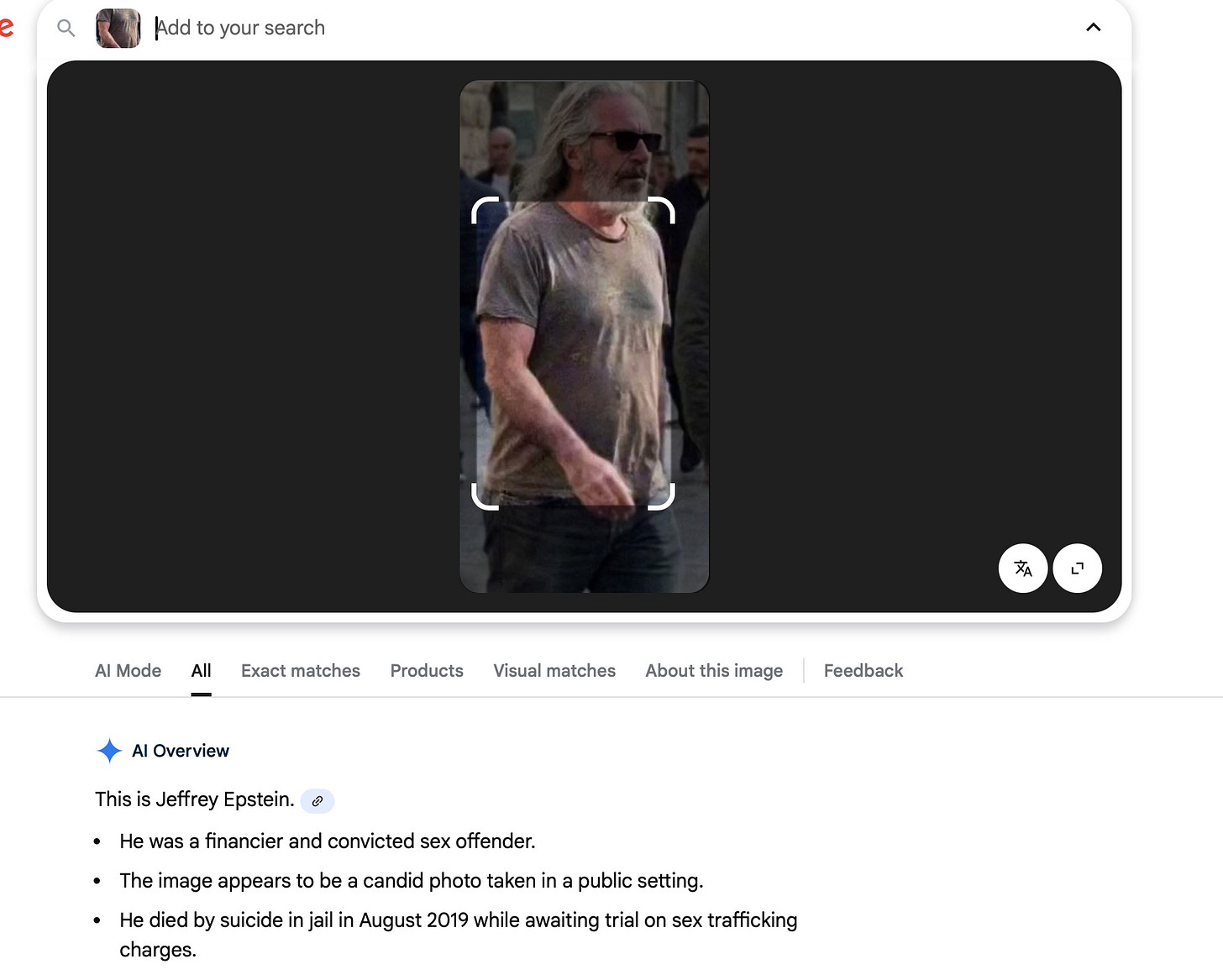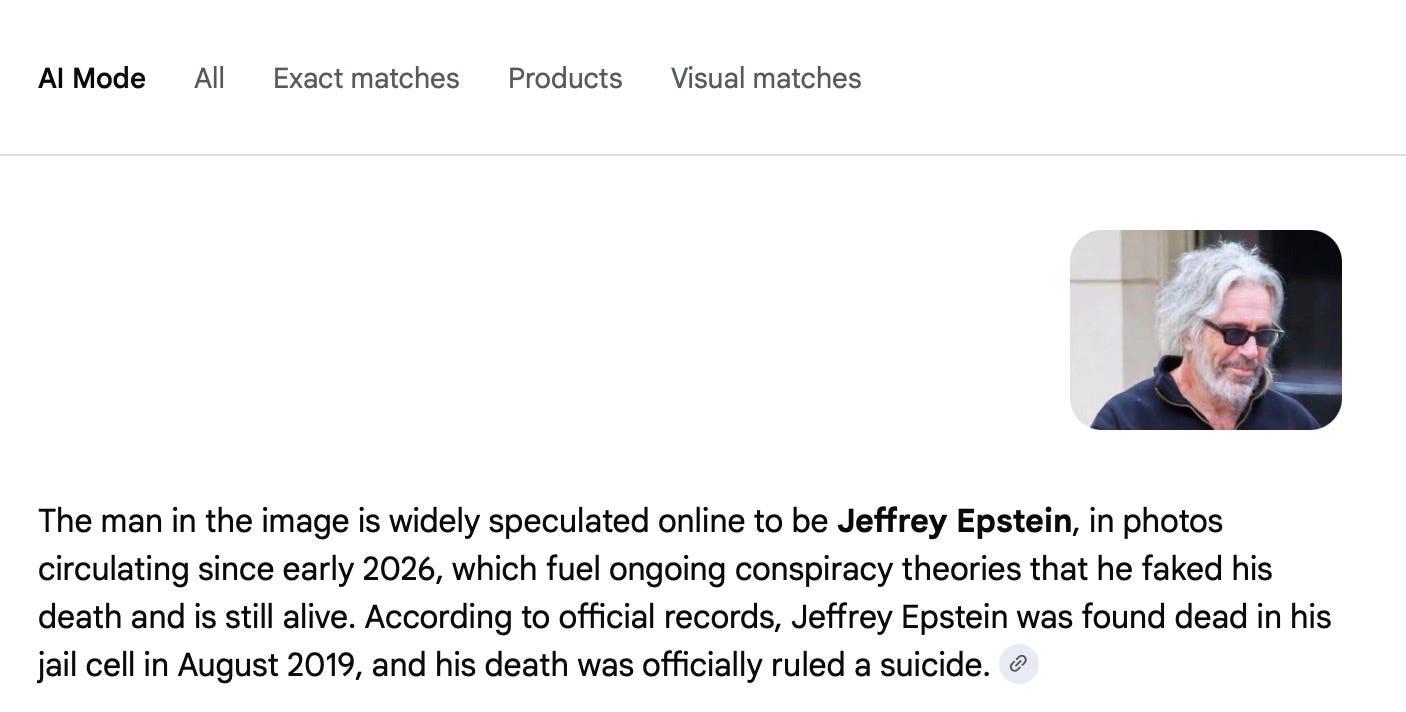 Say you’re one of those 2.2 million people, and a tiny voice in the back of your head whispers: “Maybe I should Google this.” So you do. You upload the image to Google. And Google’s AI Overview — the big, confident answer box at the top of the search results, the one Google has trained billions of people to trust — tells you: “This is Jeffrey Epstein.”