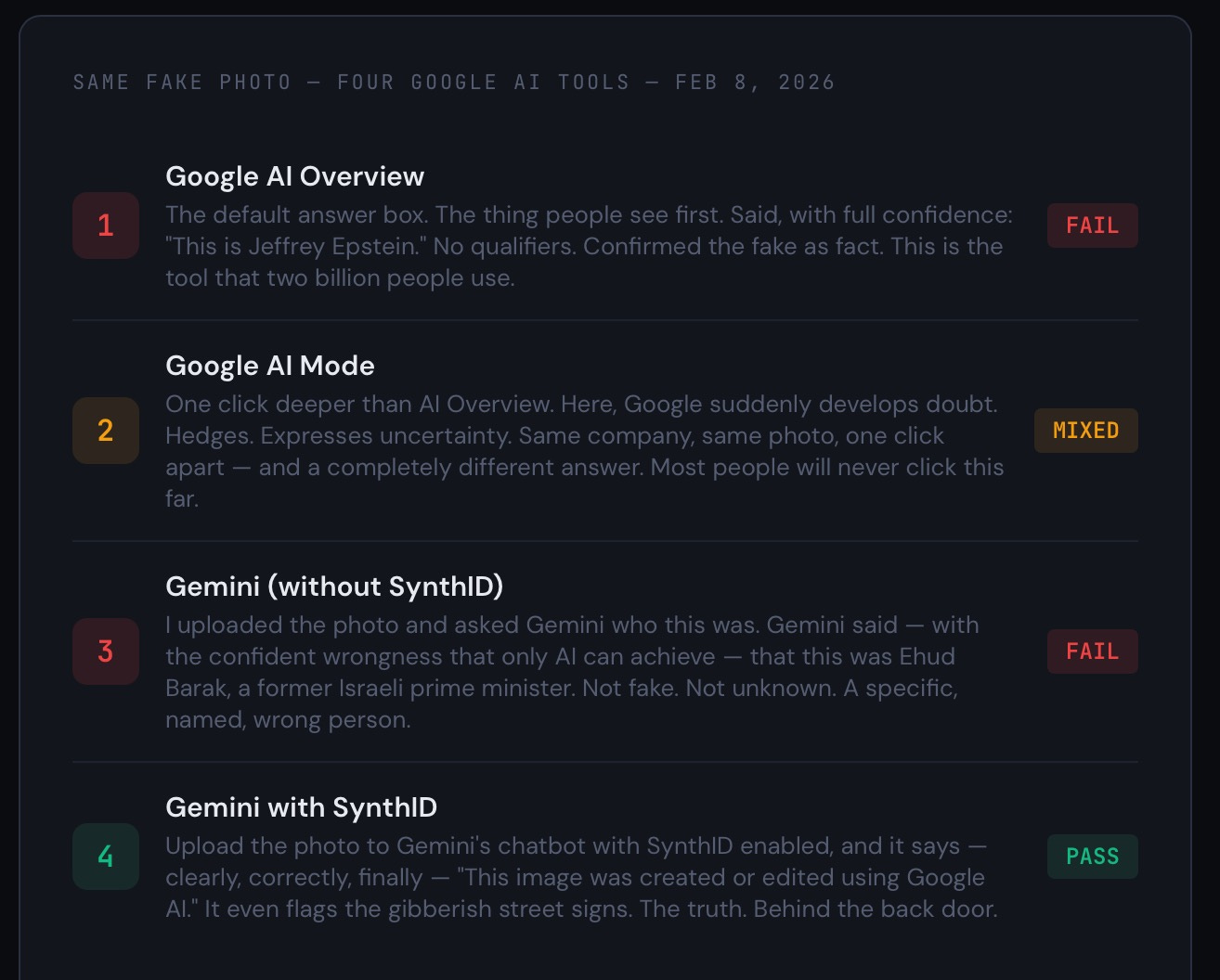 The summary: Google AI Overview — “This is Epstein.” Google AI Mode — “Maybe, maybe not.” Gemini — “That’s Ehud Barak.” Gemini + SynthID — “This is an AI fake.” Four tools. Three wrong. The right one requires a treasure map. And the fix is simple: put the SynthID result where people actually look. Google just hasn’t done it yet.