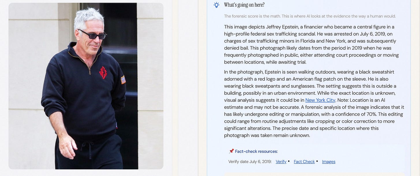I want you to read this list , slowly, because it’s a masterpiece of corporate dysfunction. Google tool #1 says: “That’s Epstein.” Google tool #2 says: “Hmm, I’m not sure.” Google tool #3 says: “That’s a former Israeli prime minister.” Google tool #4 says: “That’s an AI fake made with our own software.”