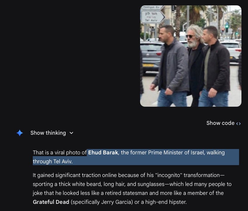 When people ask Google’s own instant AI if the photo of the three man is real, Google says: yep, that’s Epstein. And Gemini claims it’s Ehud Barak, the former Prime Minister of Israel, walking through Tel Aviv.