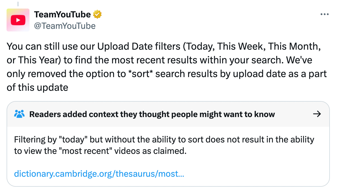 YouTube replied to say that users could still sort videos by different date ranges. It was promptly hit with a Community Note: