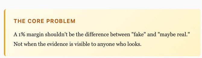 Hybrid fakes got missed entirely. Obvious fakes get scored as “maybe.” Why does this happen? Most AI detectors work like calculators — they output a number. They need to work like detectives — really look at the evidence.
