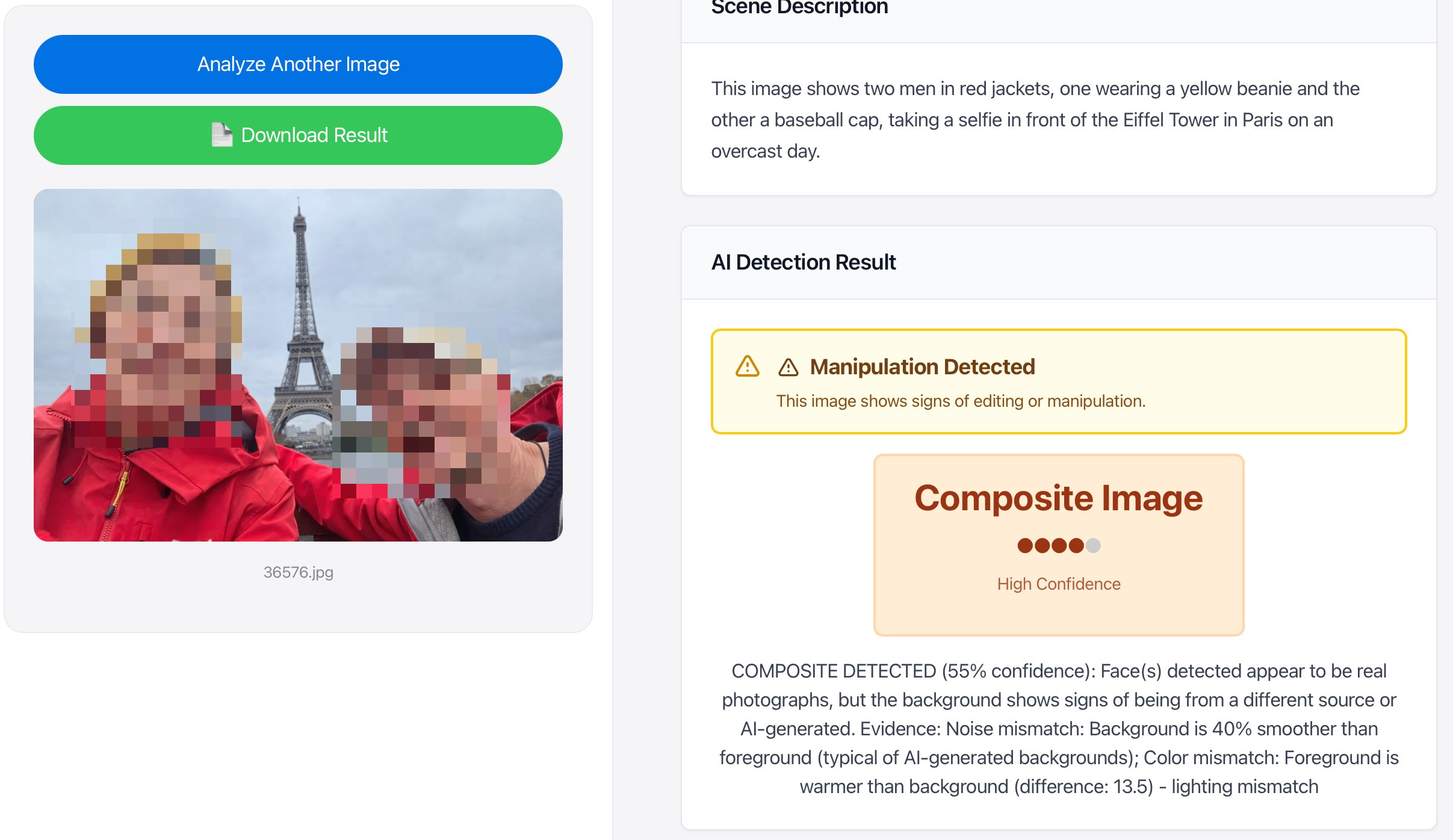 I fixed it. ImageWhisperer now separates foreground from background and compares their noise patterns. It also checks edge consistency (pasted elements have unnatural edges), lighting direction (shadows should all point the same way), and compression artifacts.