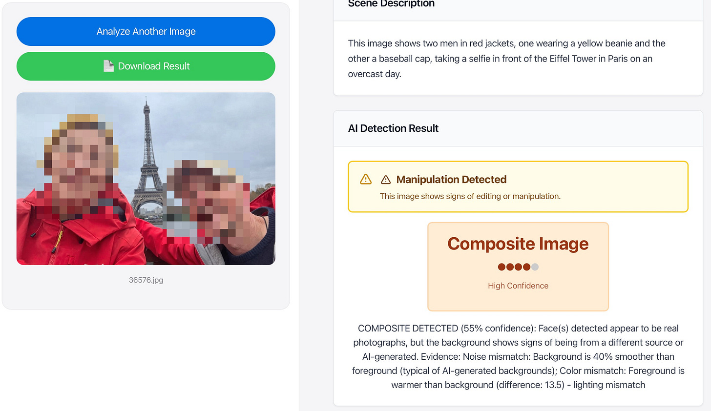 Think about why. Le Nagard’s image wasn’t fully fake. He and his friend were real. He just wasn’t actually in Paris. The detector was looking for a 100% synthetic image and found a 100% real person — so it shrugged.