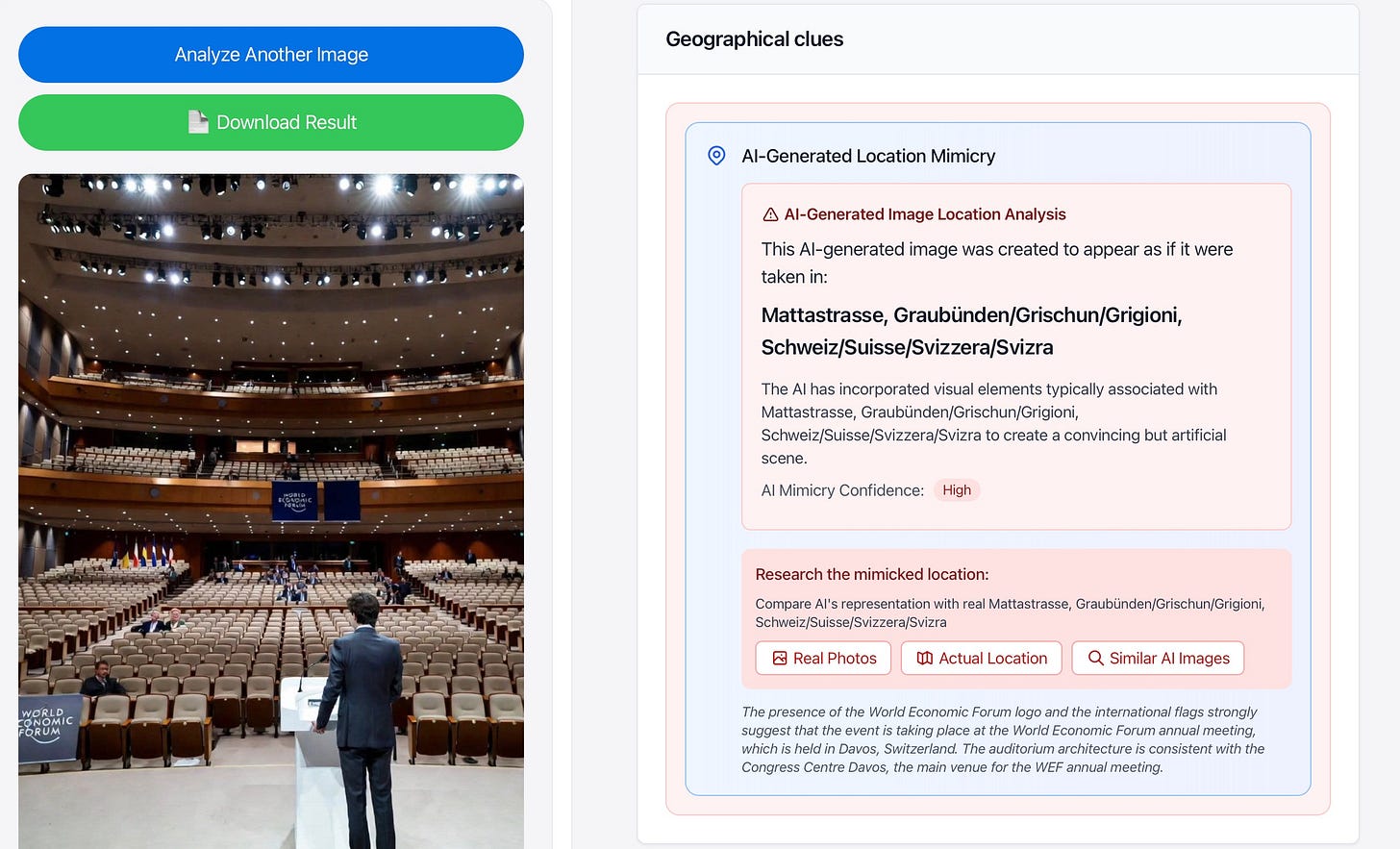 New verdict: “Likely AI — 2 of 3 models detect with high confidence”I added a sort of “detective” to the tool: it now queries four different AIs to check for anything suspicious in the photo. Most of them caught the warped faces, so I've incorporated that into the verdict. I also ask the models to predict where the creator wants us to believe the photo was taken—helpful for understanding the intent behind a fake.