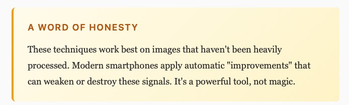 Every camera creates a specific pattern of tiny imperfections in photos — a “fingerprint” scientists call Photo Response Non-Uniformity (PRNU). If a photo is real, the entire image has the same fingerprint. But if someone pastes themselves from Camera A onto a background from Camera B, now there are two different fingerprints in one image. It’s like a crime scene where the DNA on the doorknob doesn’t match the DNA on the murder weapon.